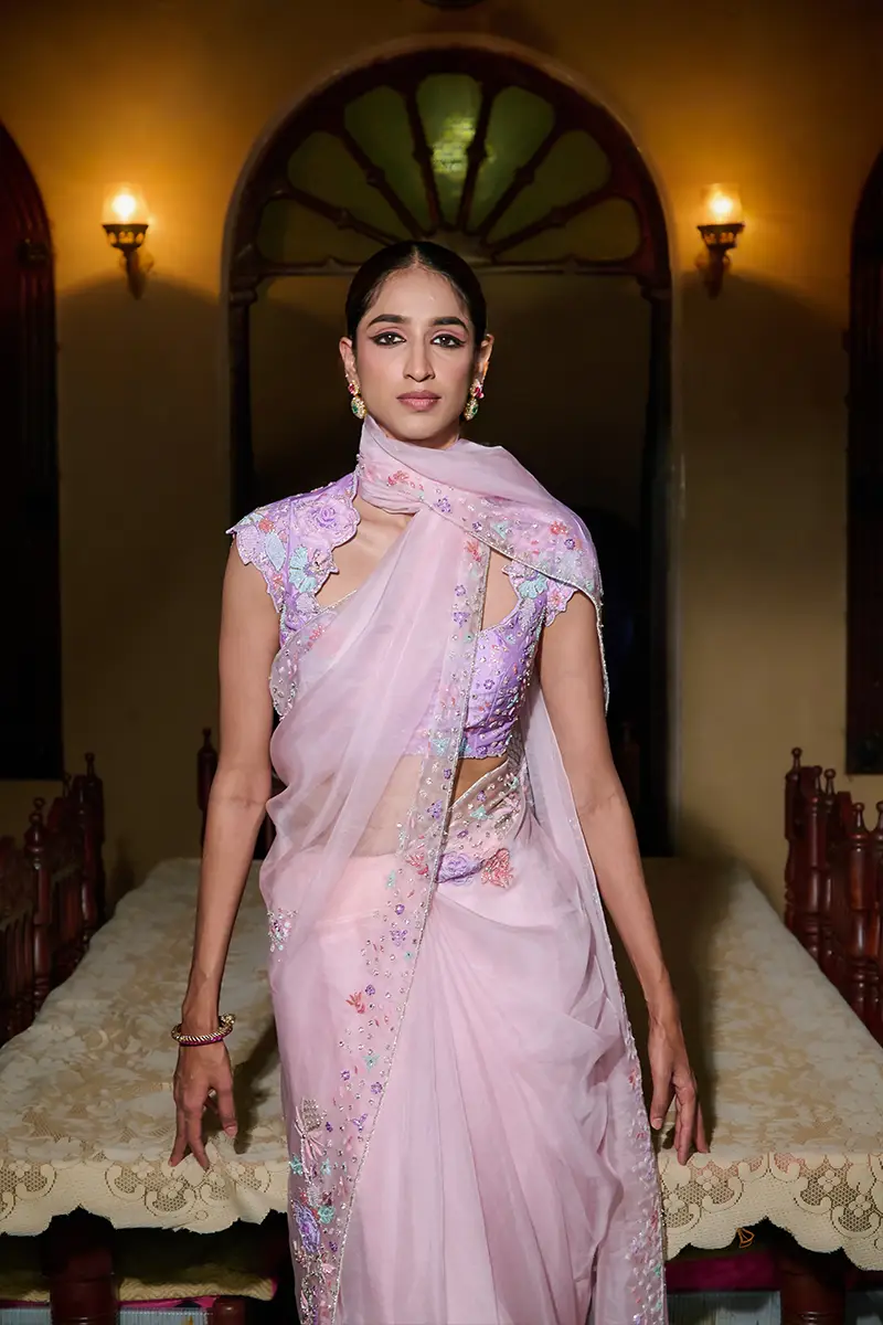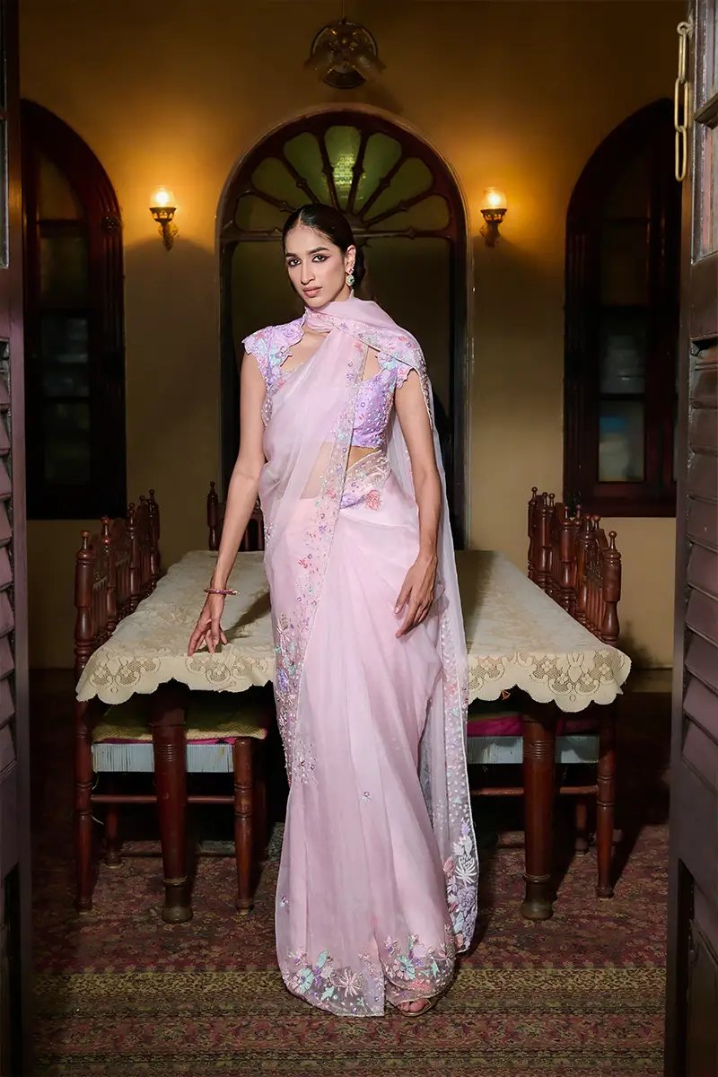 A graceful light pink organza saree adorned with vibrant multi-color patchwork, delicately highlighted with fine embroidery. Paired with an intricately embroidered contrast blouse featuring a stylized neckline, this ensemble strikes the perfect balance of elegance and modern charm.