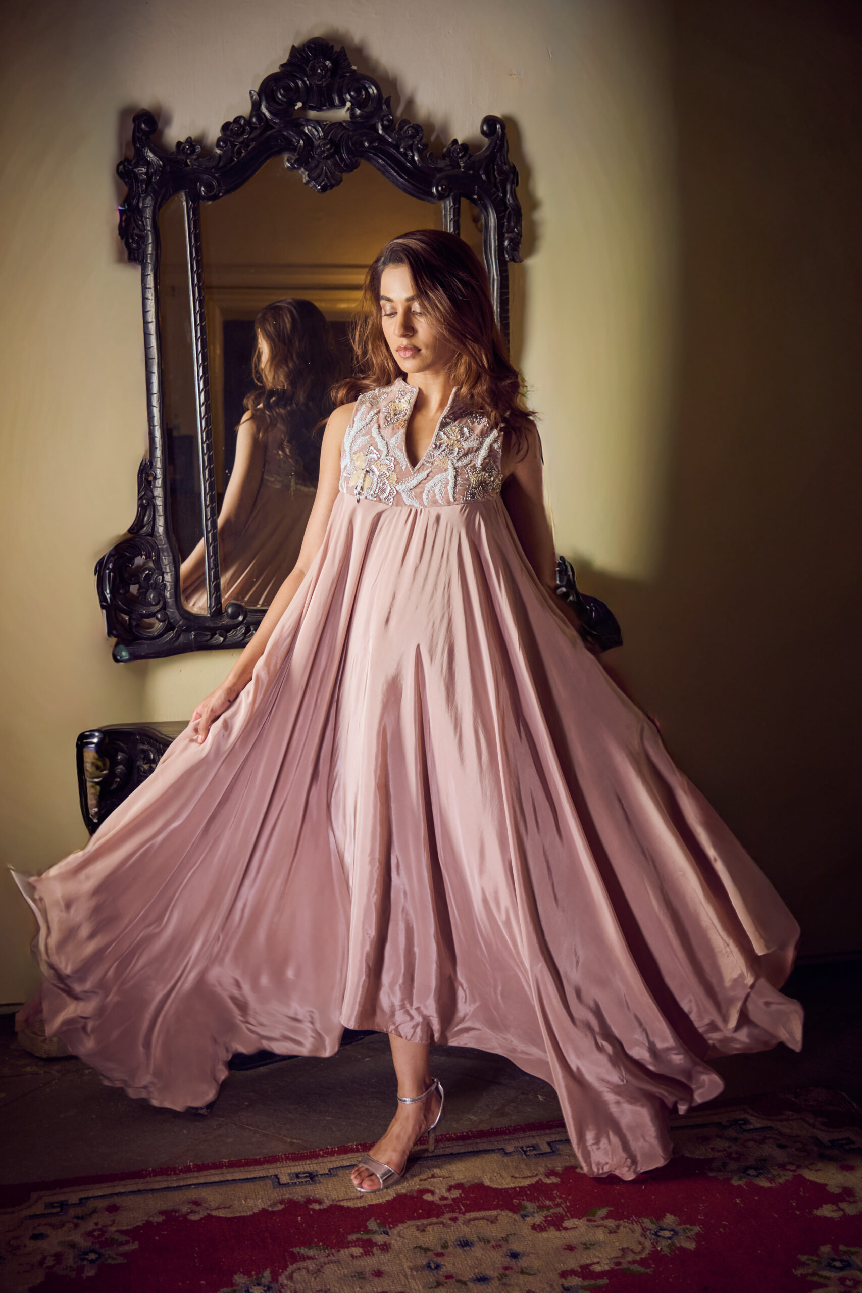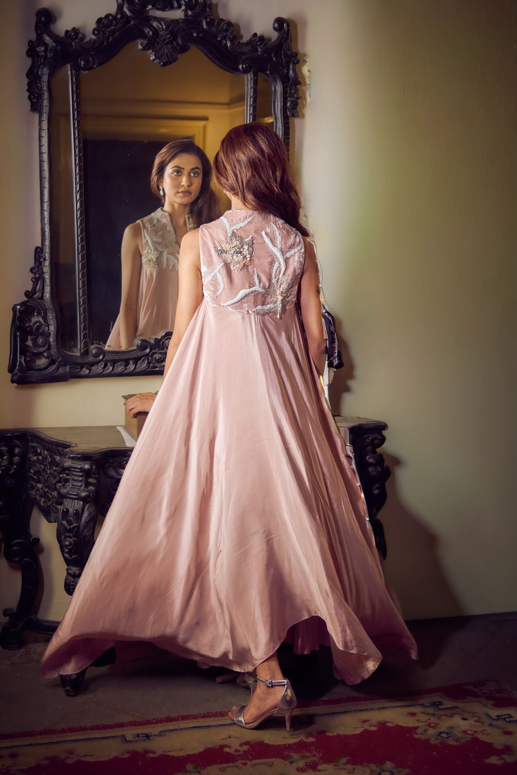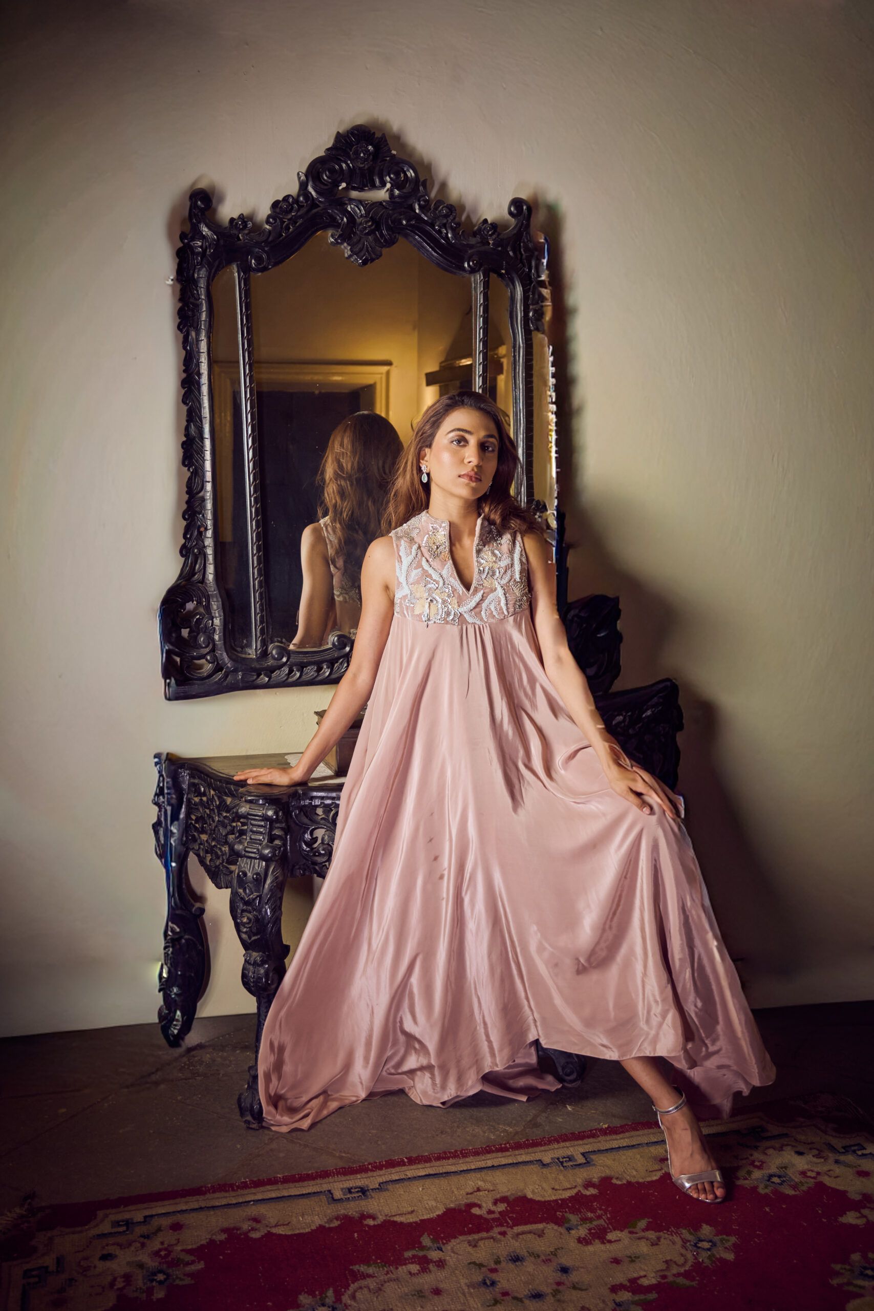 Beige-pink dress featuring an abstract floral pearl-embellished yoke with crystal hangings, paired with a high-low layered skirt for a contemporary, statement look.