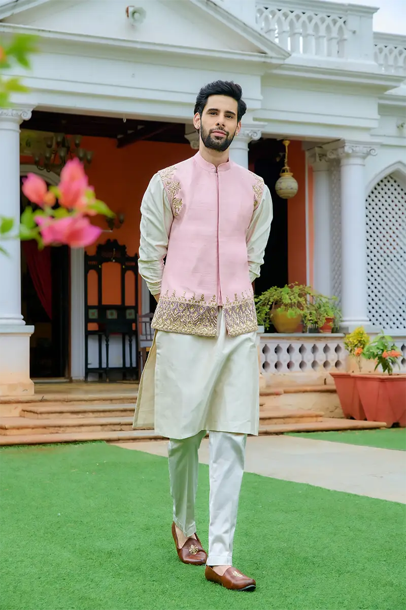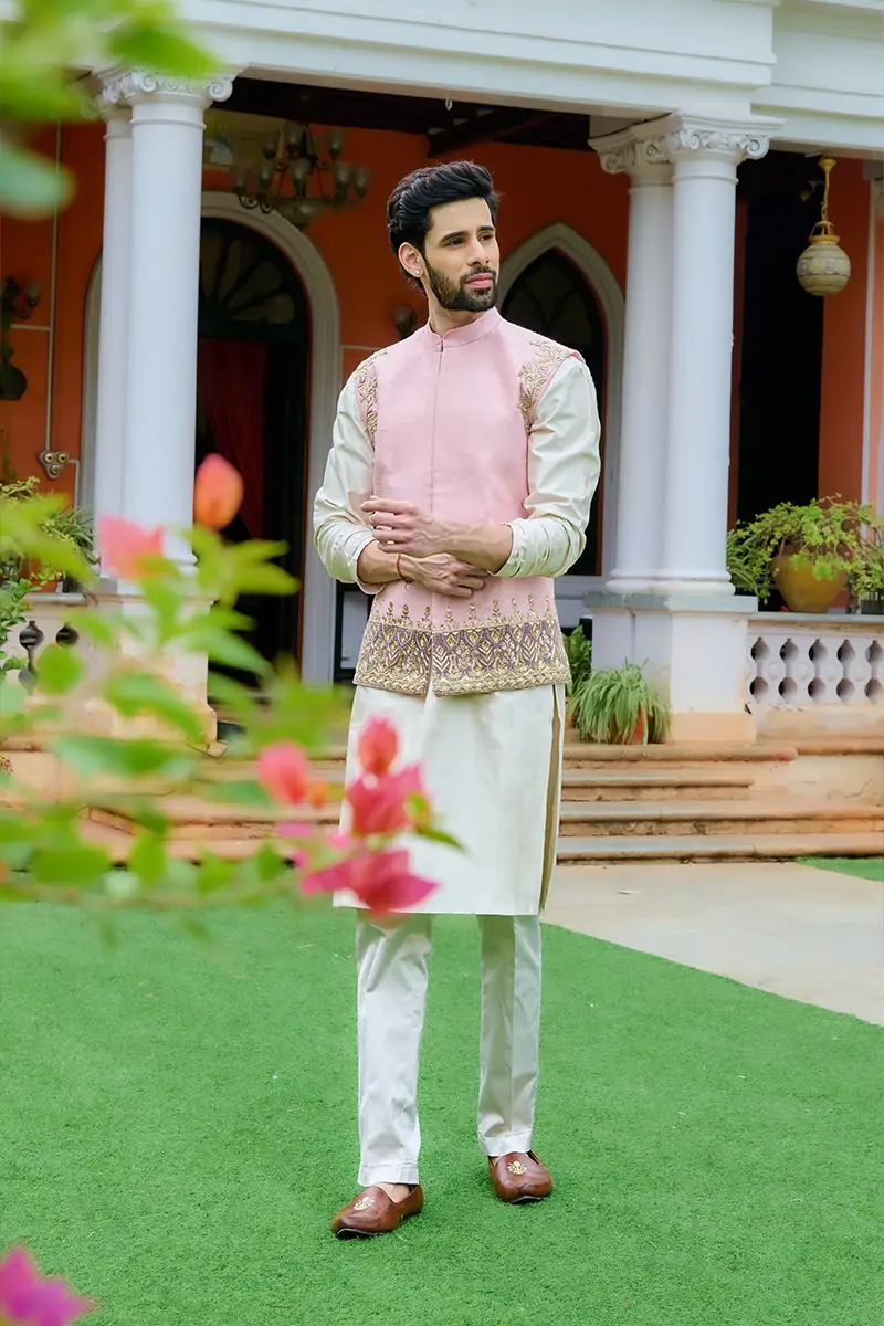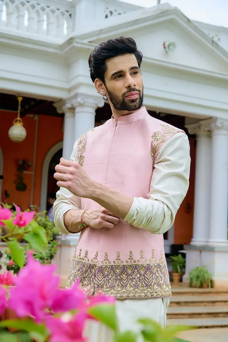 Blush pink long jacket with delicate floral embroidery on the shoulders and intricate gold work along the hem.