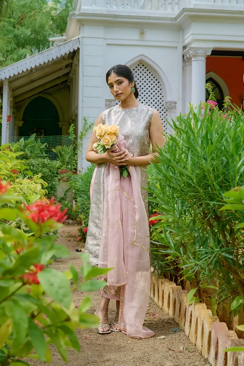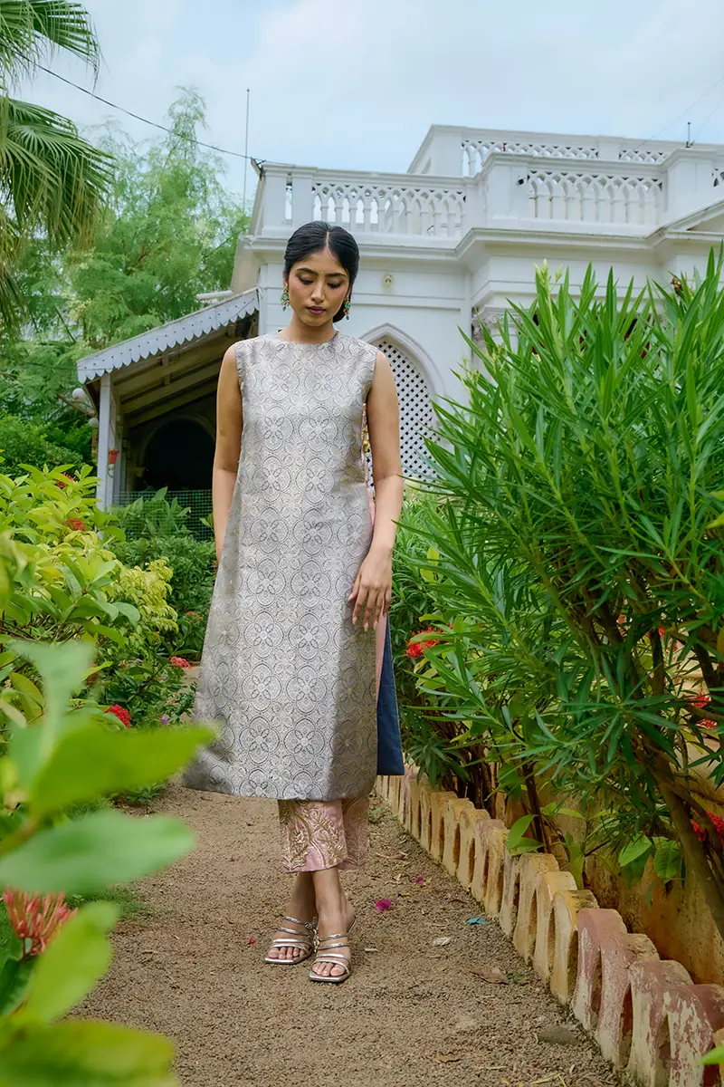 A long brocade kurti with a side pink panel adorned in delicate floral embellishments, paired effortlessly with sleek pink pants.