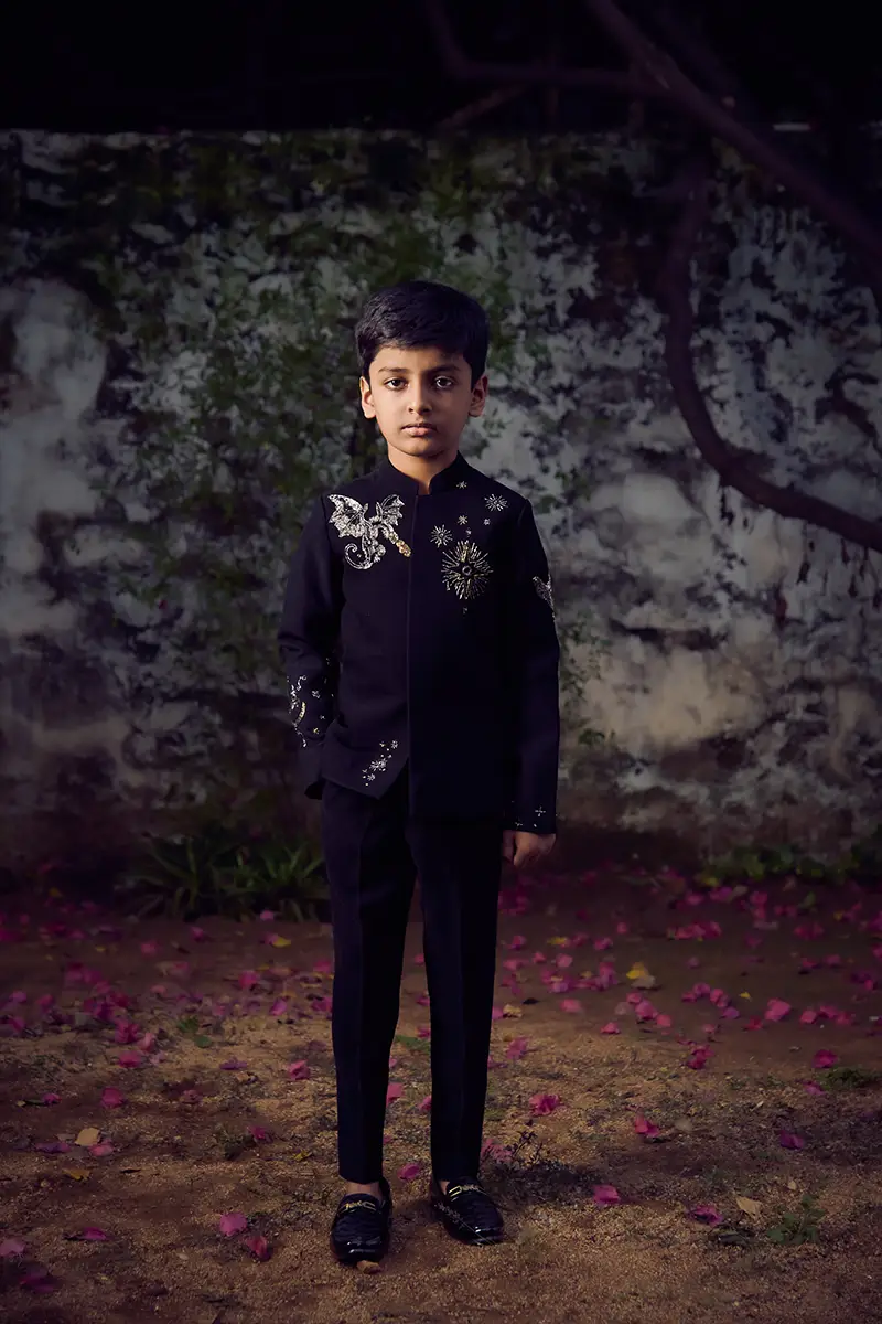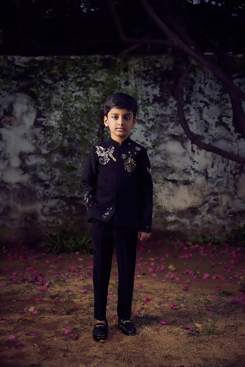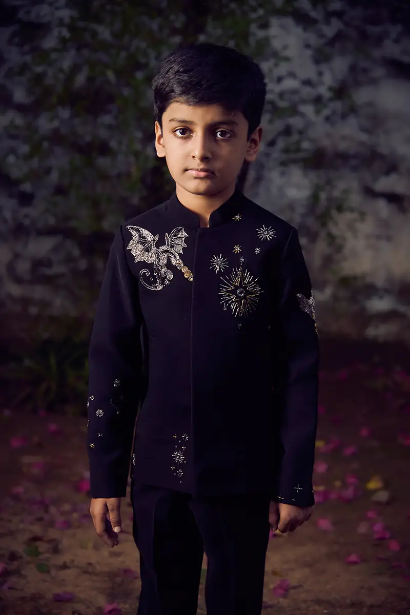 A black suit featuring embellished abstract motifs, paired with matching tailored pants.