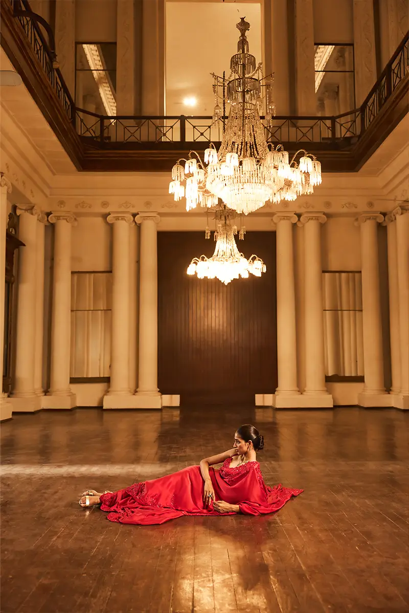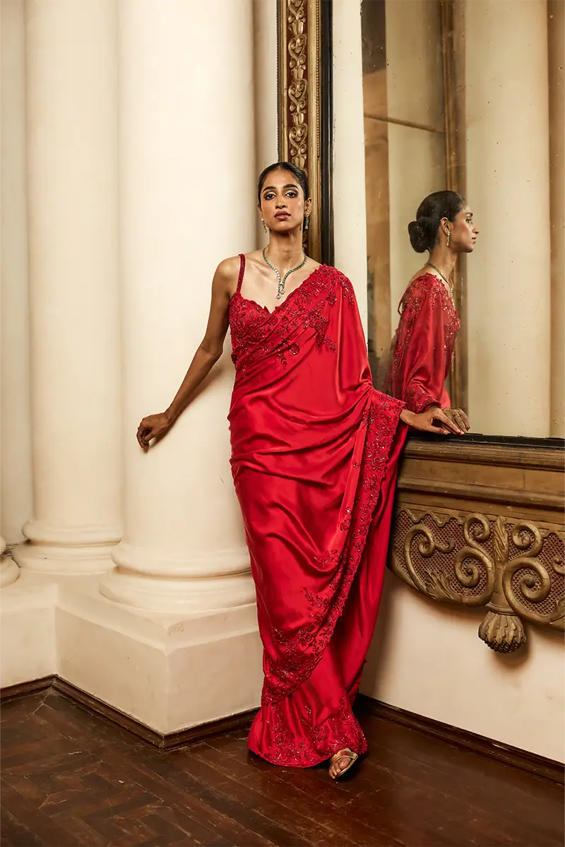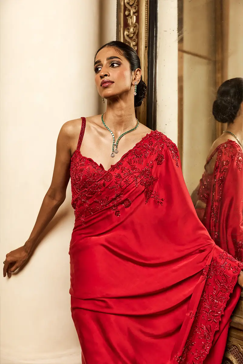 A striking red saree adorned with a floral embellished cutwork border, paired with an embroidered blouse featuring intricate floral motifs, shimmering sequins, and a structured geometric waistband ideal for a statement-making cocktail or festive occasion.