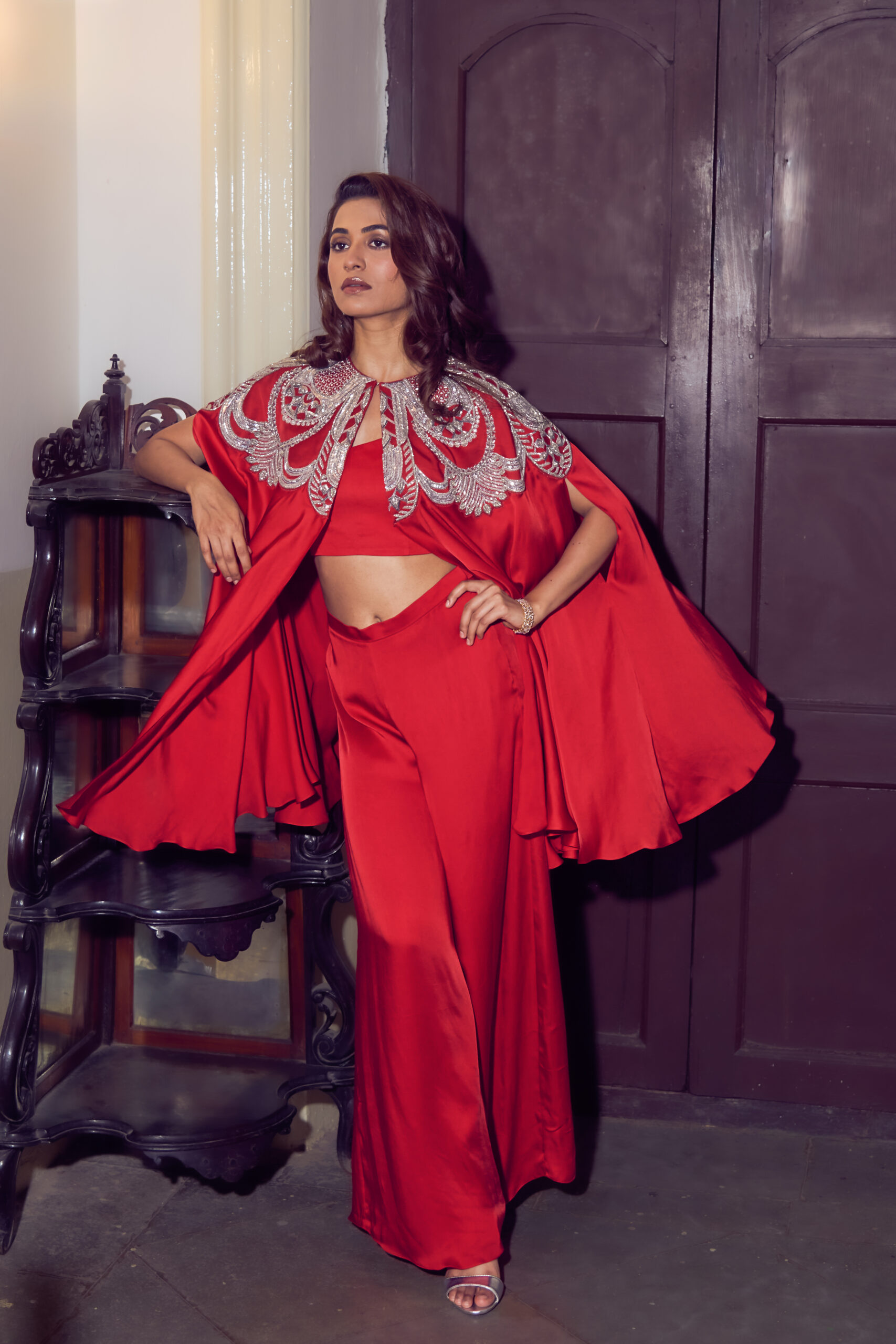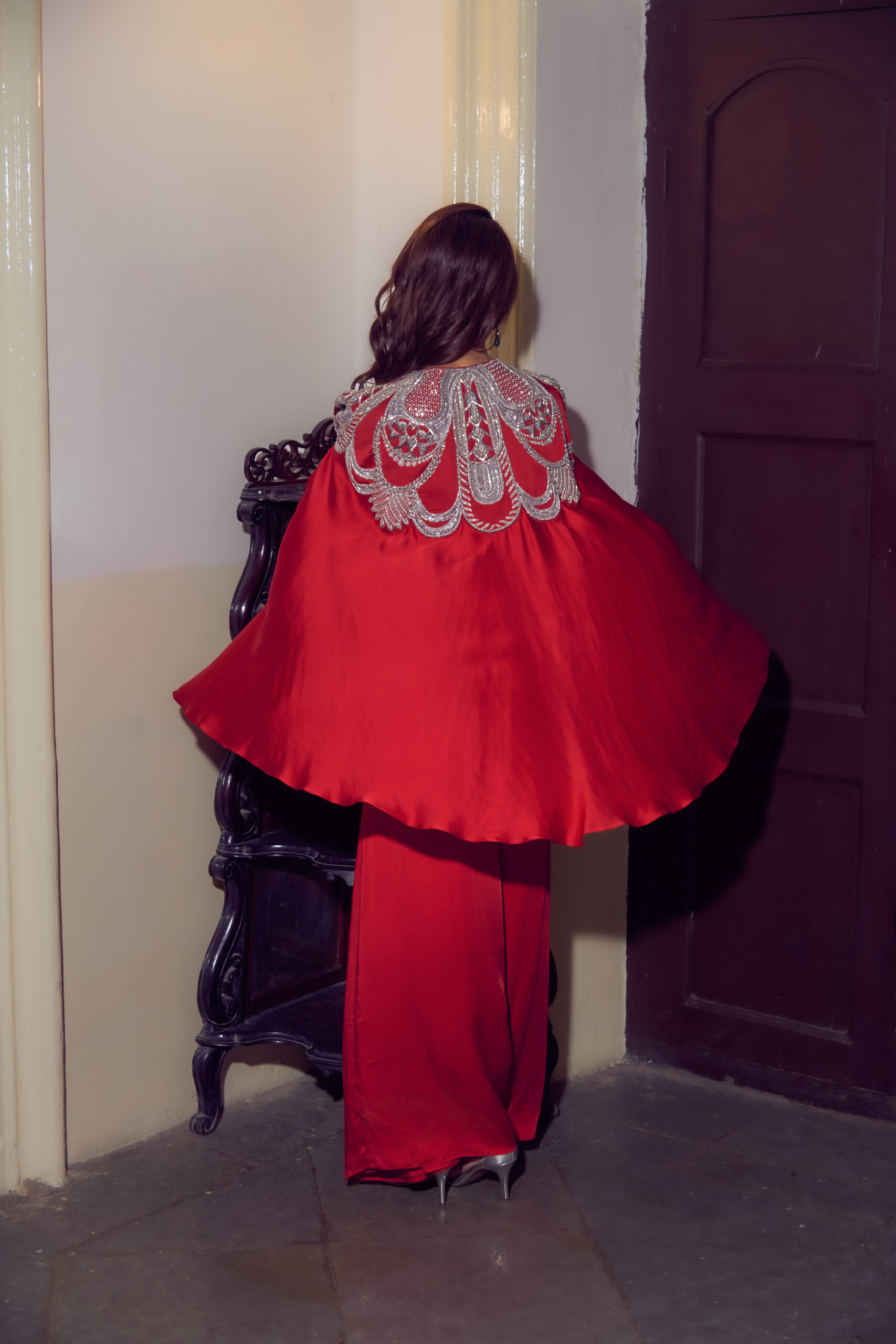 A bold crimson cape exuding regal charm, featuring a dramatic hand-embroidered yoke in metallic silver. The intricate design blends geometric and ornamental patterns, creating a sculptural neckline that commands attention. Crafted in a fluid, draped silhouette