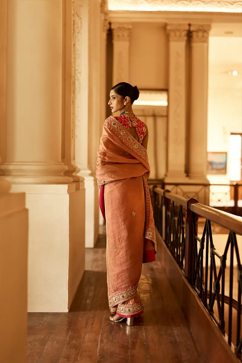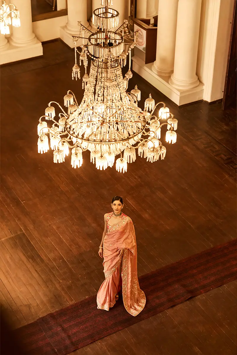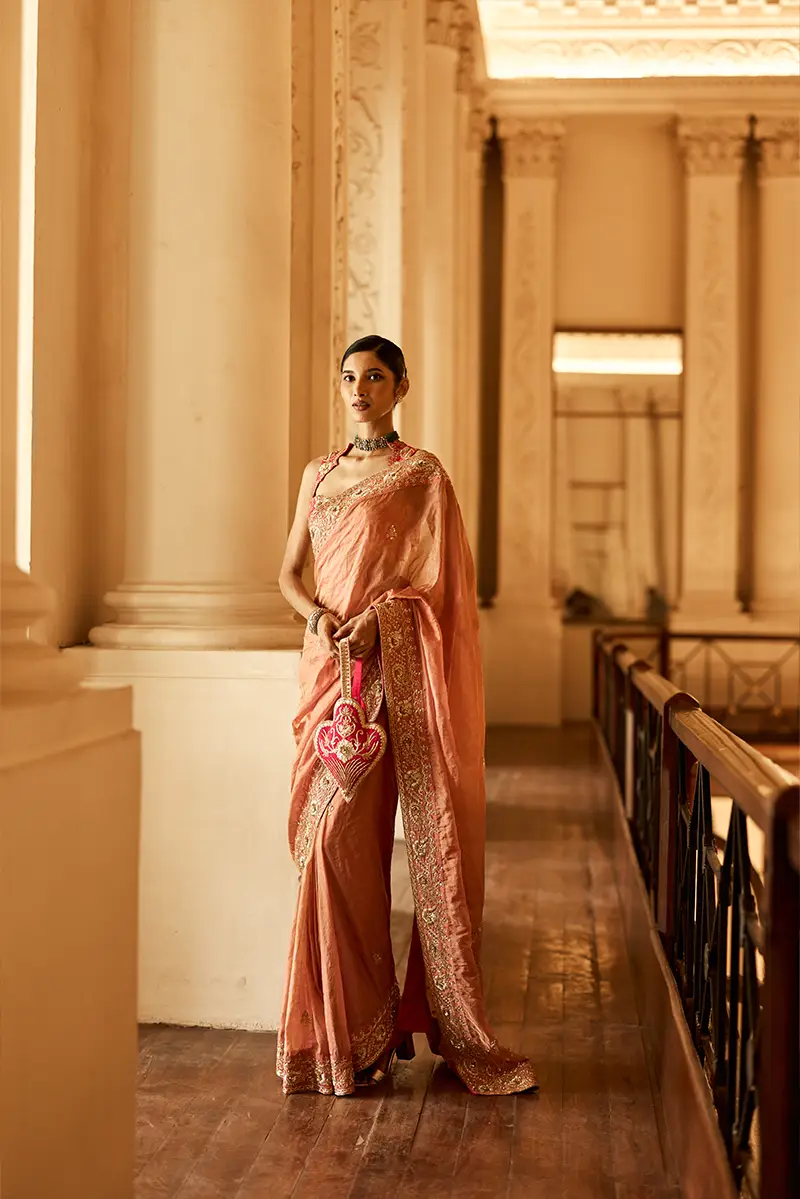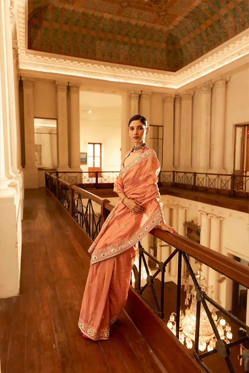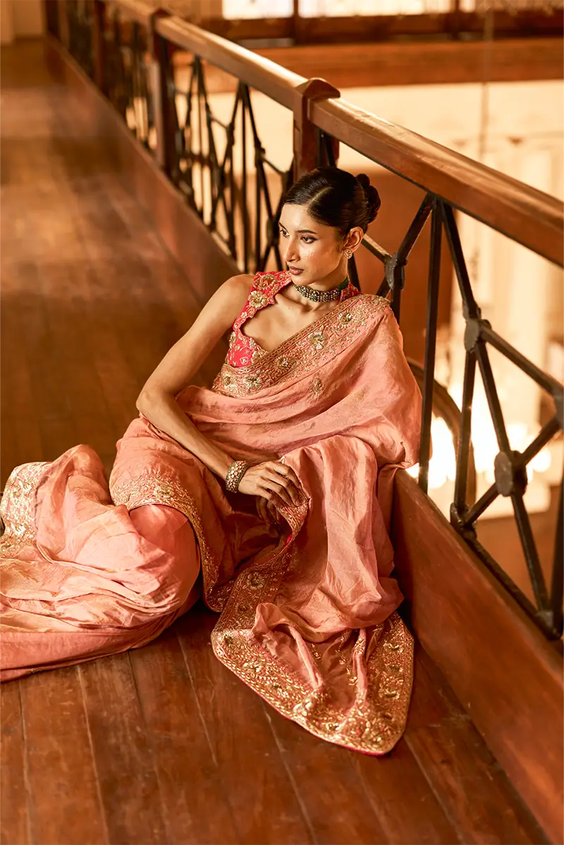 A vibrant pink tissue saree set adorned with elaborate gold floral embroidery and traditional motifs, featuring a heavily embroidered blouse and intricately detailed borders that exude a regal charm.