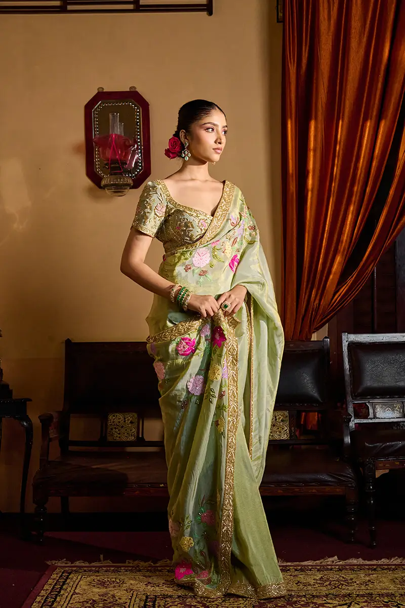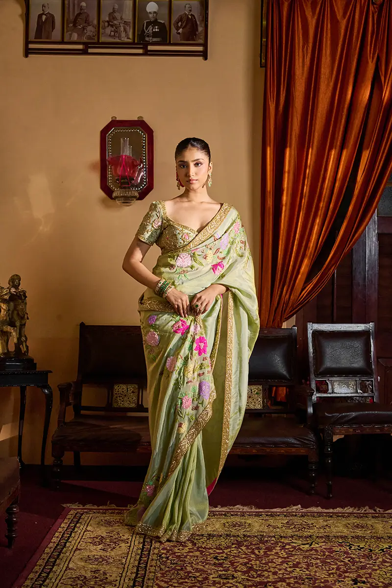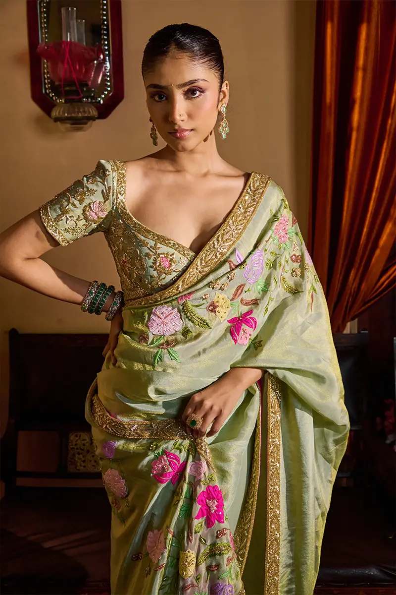 A pastel sage green saree featuring vibrant multicolored floral embroidery, paired with a heavily embellished blouse adorned with intricate Zari, Resham, and sequin work perfect for festive and celebratory occasions.