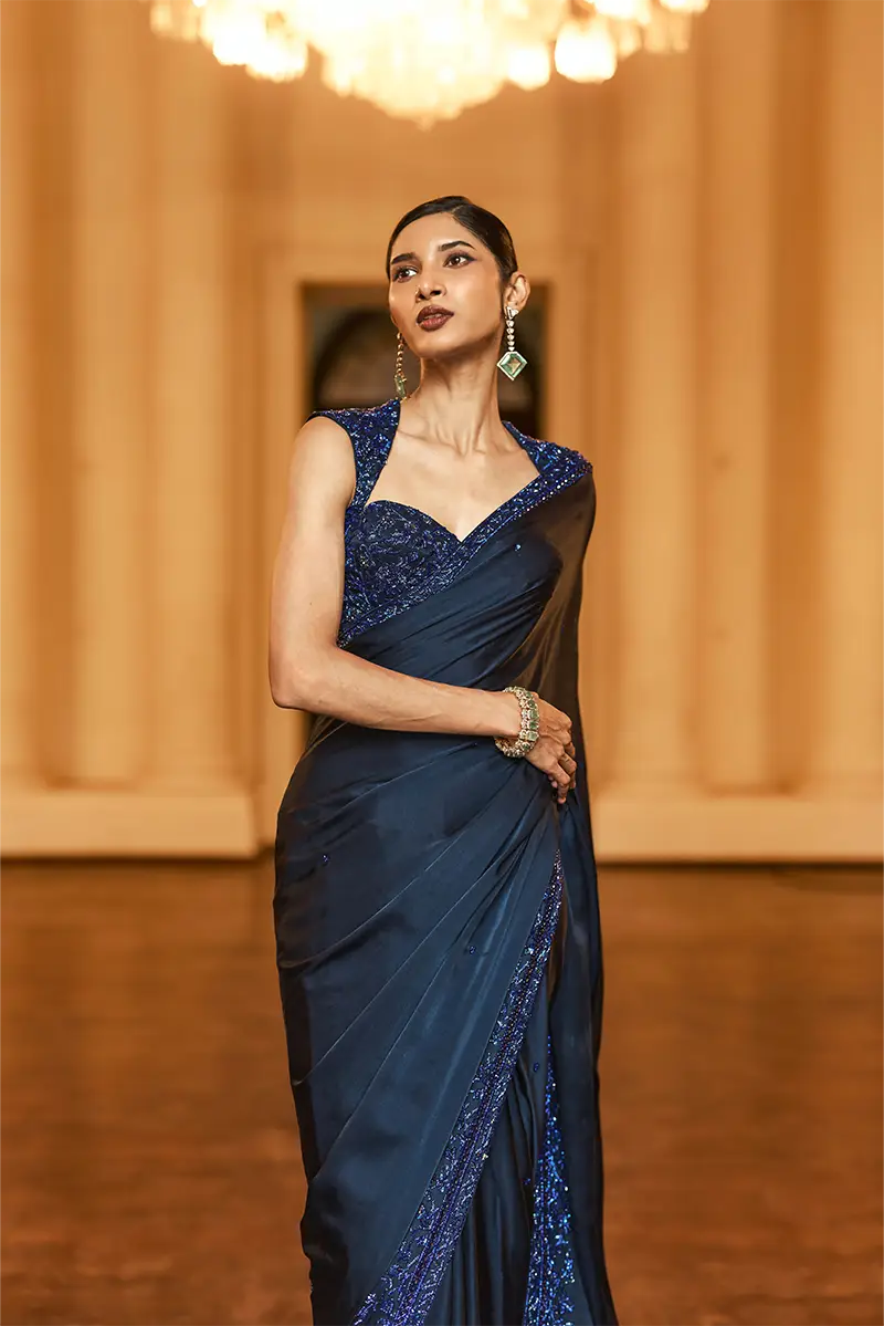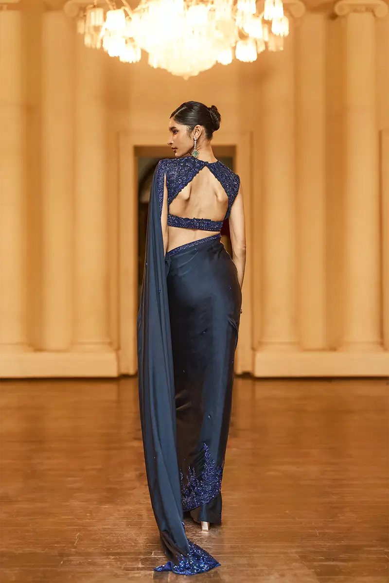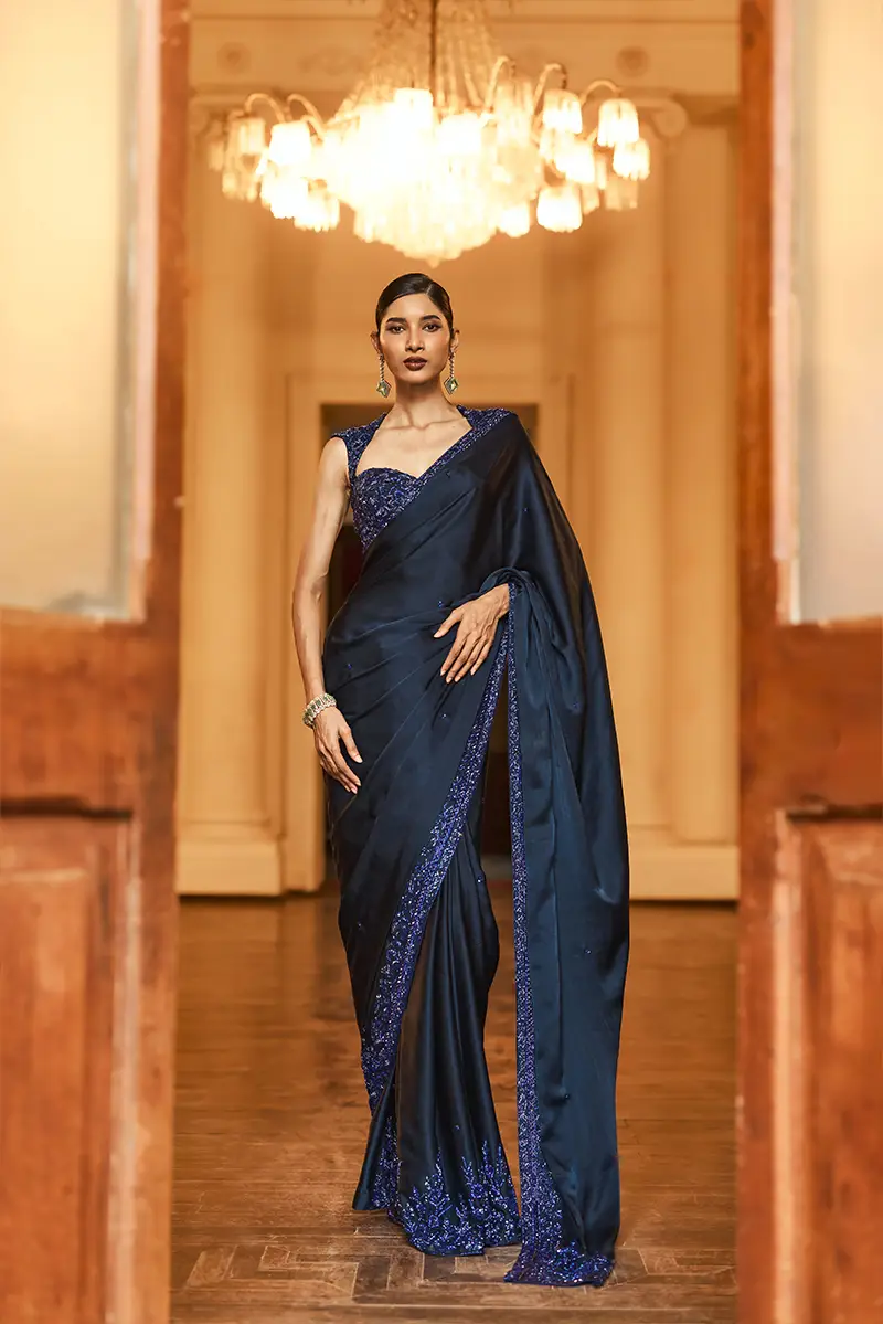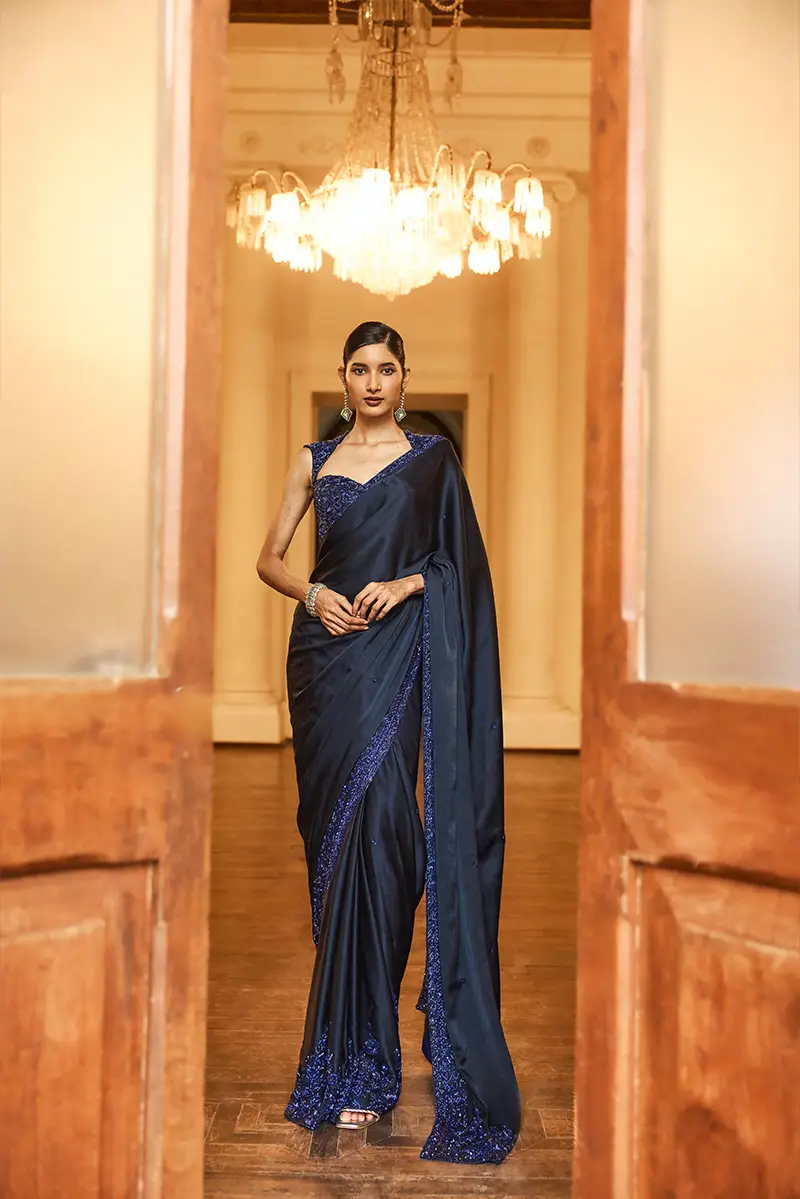 A midnight blue saree adorned with subtle sequin motifs throughout and elevated by a chic high-low floral embellished border, paired with a sleeveless blouse featuring elegant all-over floral embellishments perfect for a sophisticated cocktail evening.