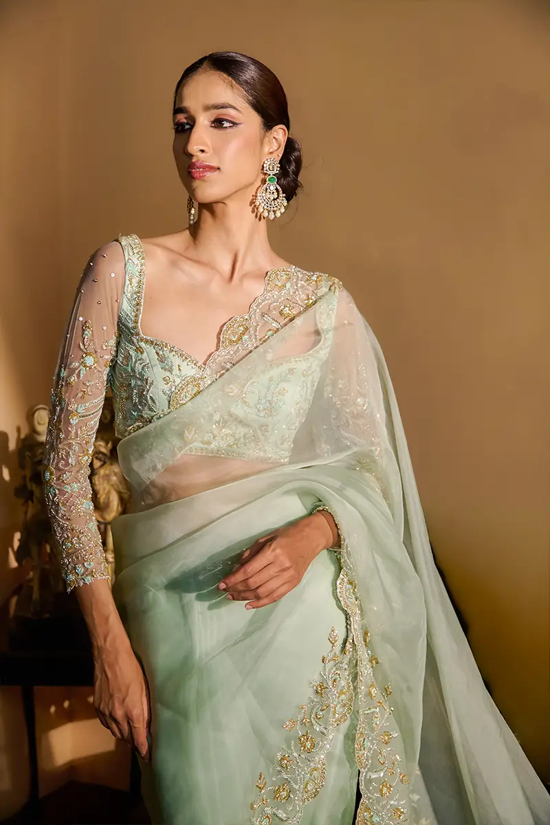 A pastel green saree featuring a scalloped edge and an abstract floral embellished border, paired with a full-sleeve blouse adorned with all-over floral embellishments.