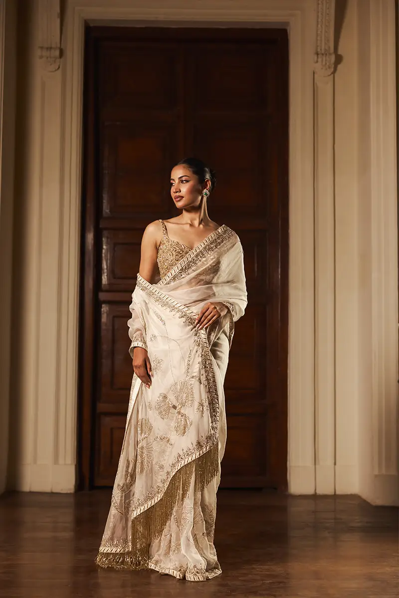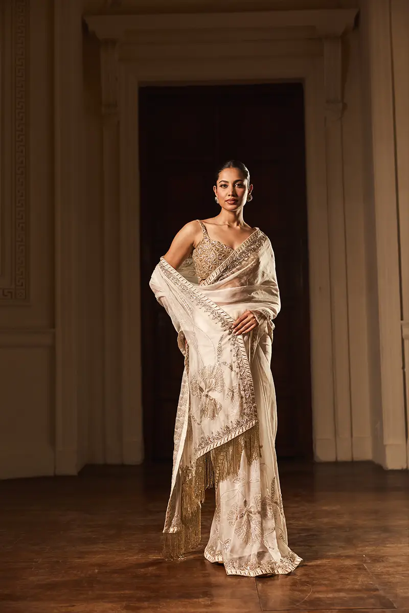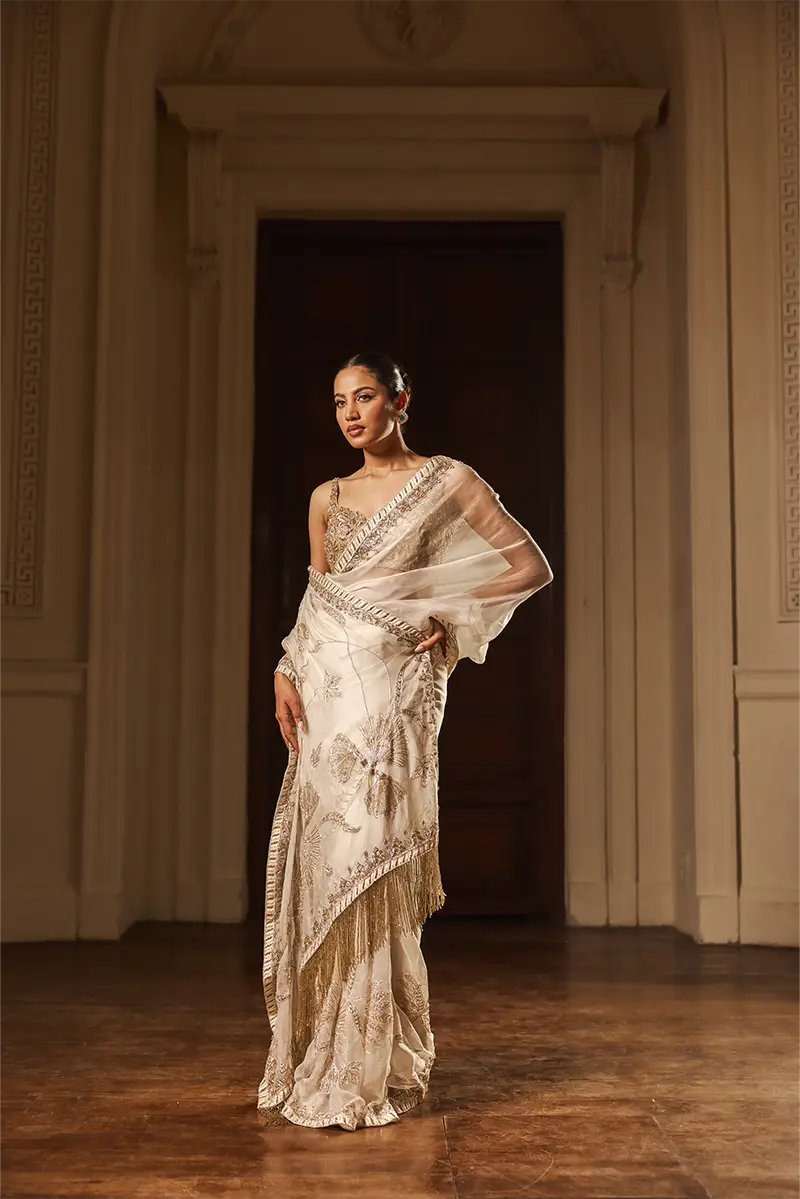 A whisper of ivory drapes in grace, kissed by gold and silver blooms that shimmer like morning dew. Its delicate borders trace a tale of elegance, paired with a blouse woven in abstract dreams, where every thread sparkles with artistry