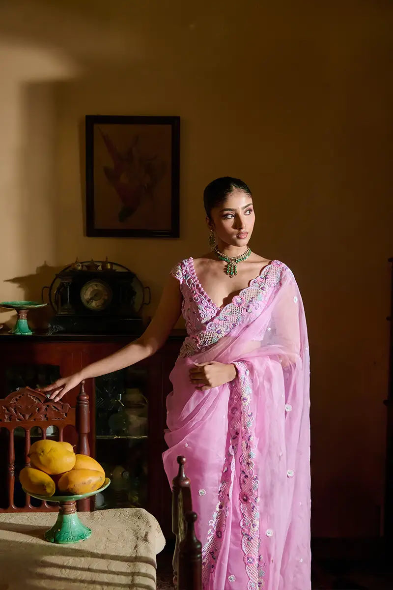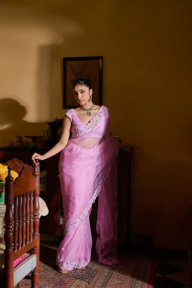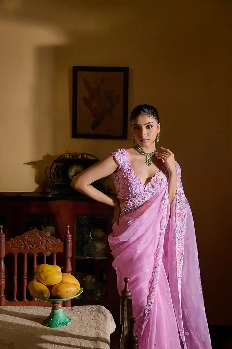 A dream in pastel pink, this saree blooms with delicate florals and checkered motifs, framed by a scalloped border shimmering with intricate embellishment. Paired with an elegant V-neck blouse, adorned with all-over floral detailing a graceful harmony of charm and craftsmanship, perfect for moments steeped in beauty.