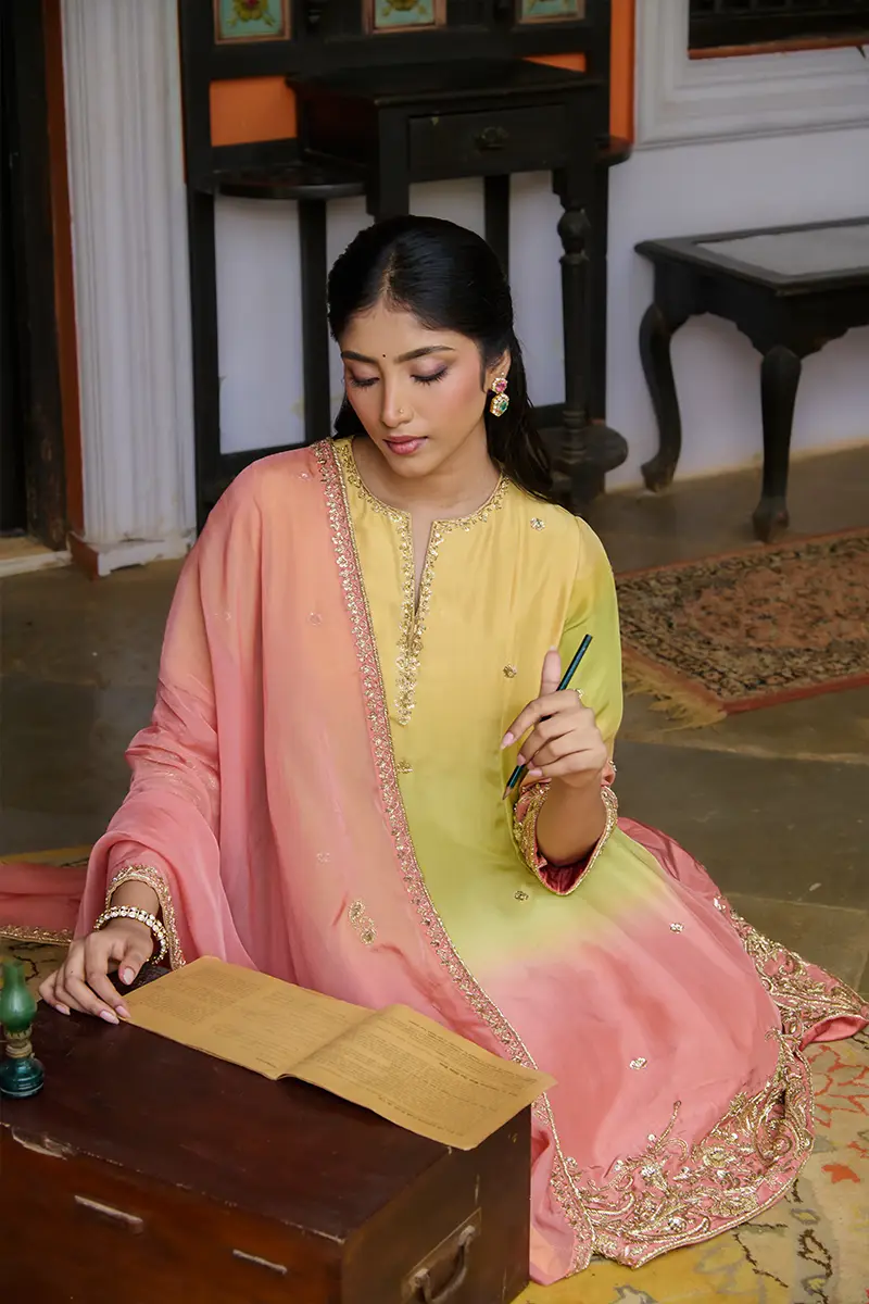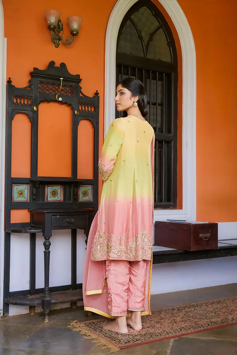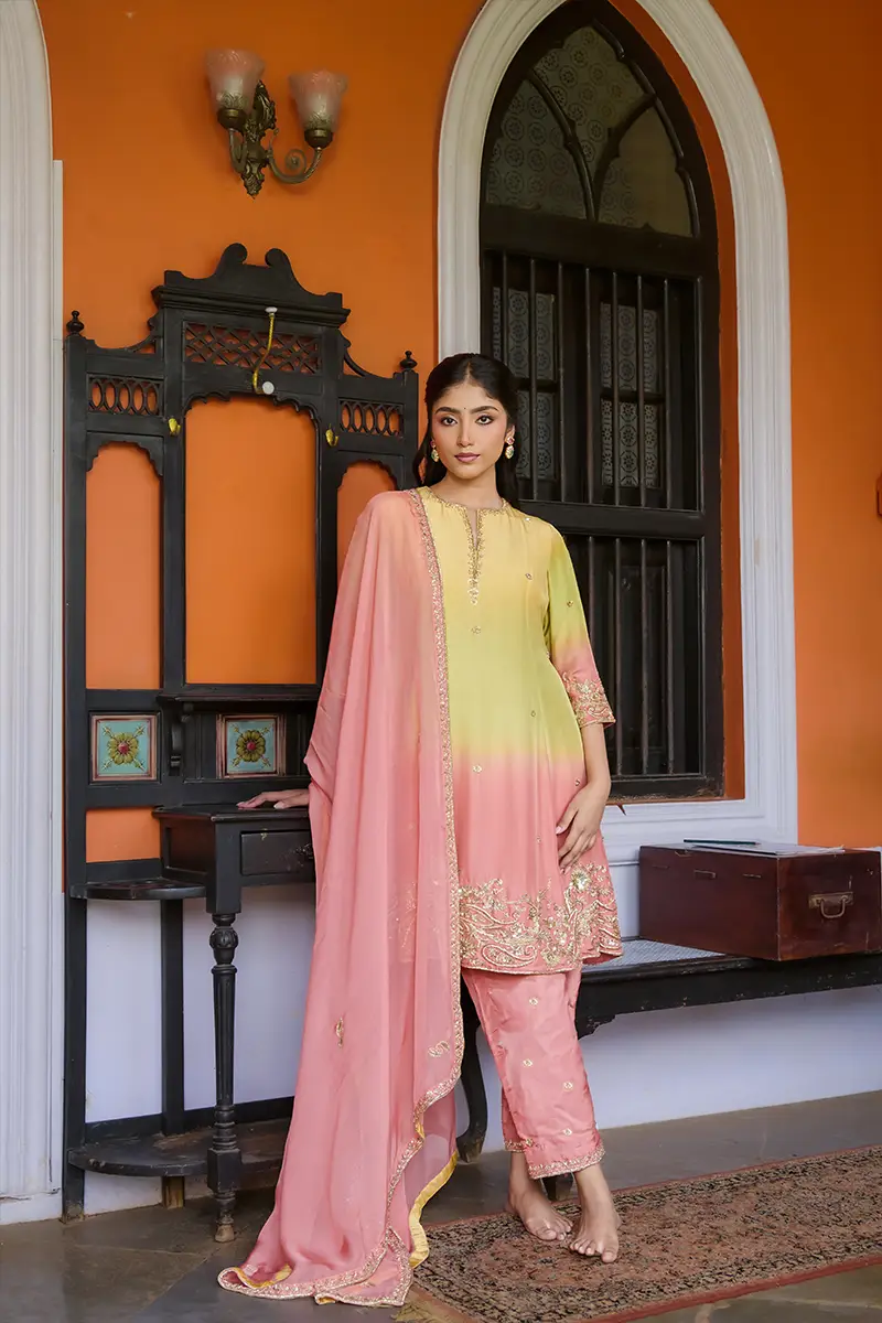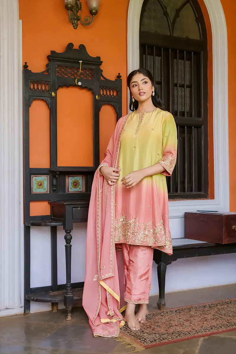 Pastel ombré kurti accented with refined gold embroidery at the neckline and an intricate abstract hem design. Styled with coordinated embroidered pants and a matching dupatta, this look blends contemporary elegance with timeless detailing.