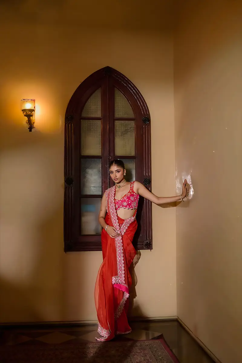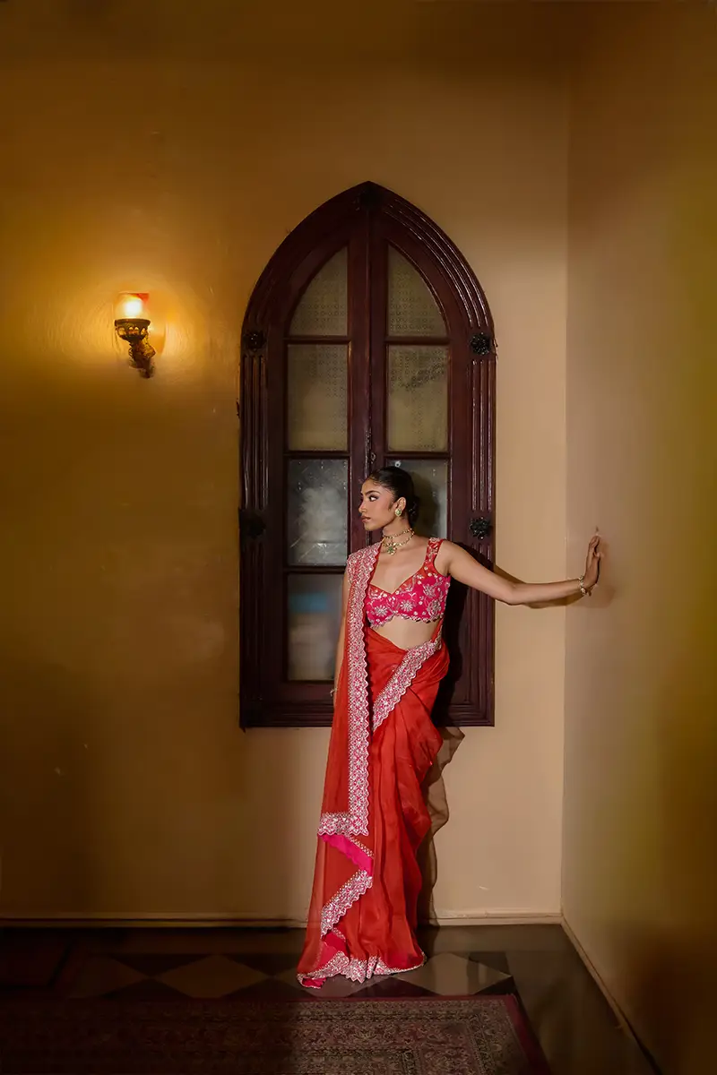 A red-orange saree featuring a silver embellished cutwork edge and a geometric floral pink border, paired with a dual-tone blouse adorned with intricate silver embellishments.