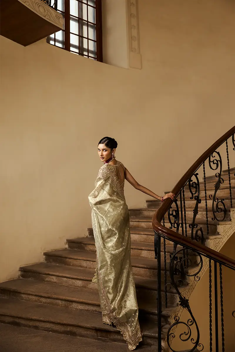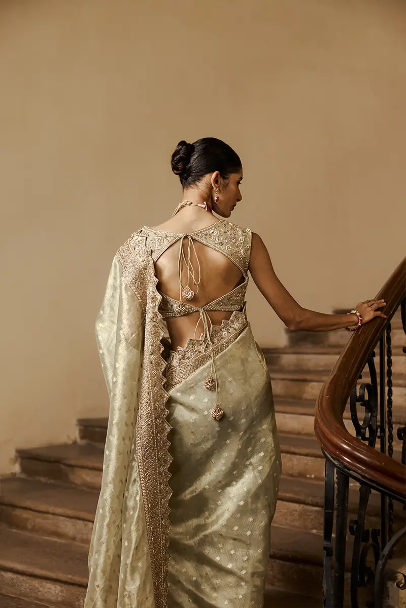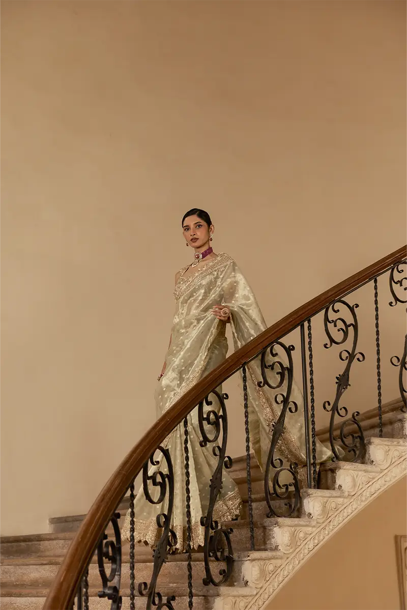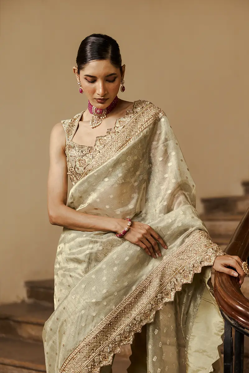 A pastel green pure tissue saree featuring all-over self-weave floral motifs and an intricately detailed broad border, paired with a blouse adorned with rich all-over floral embroidery a graceful ensemble perfect for daytime celebrations and intimate gathering