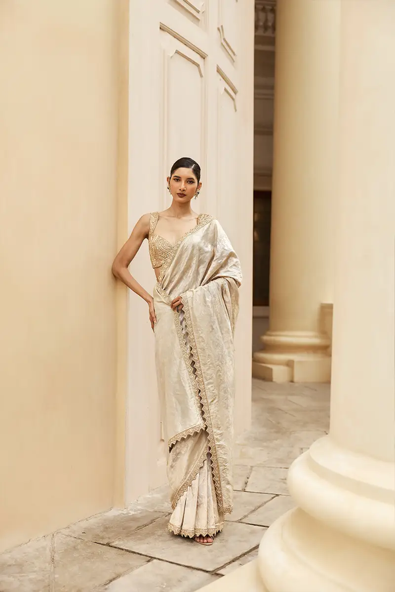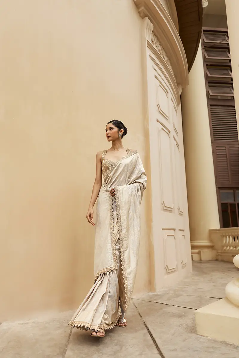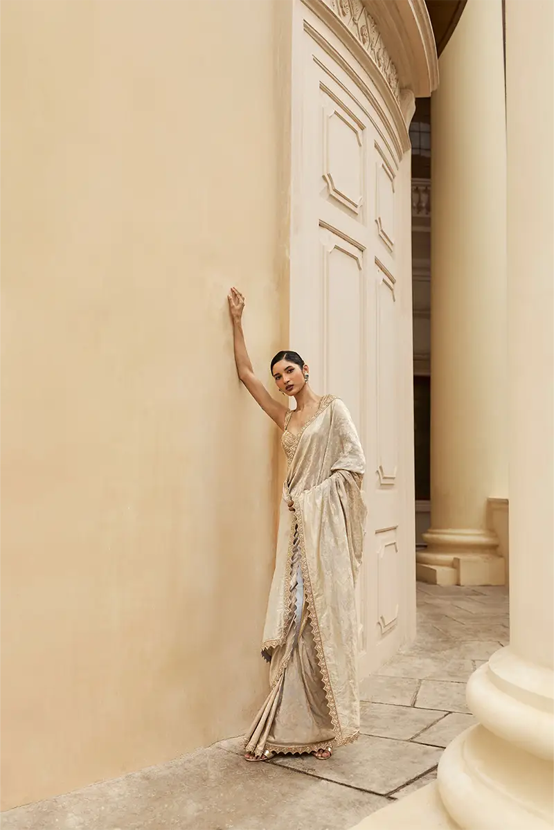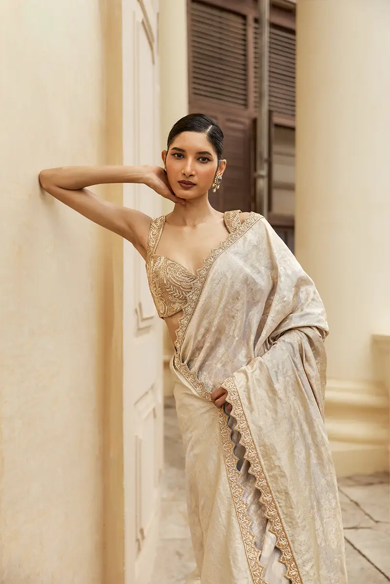 A timeless grey and gold Banaras saree, paired with a richly embroidered gold blouse and finished with an intricately crafted cutwork border. The ensemble exudes festive grandeur and refined elegance, making it a perfect choice for celebratory evenings and soirées.